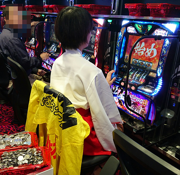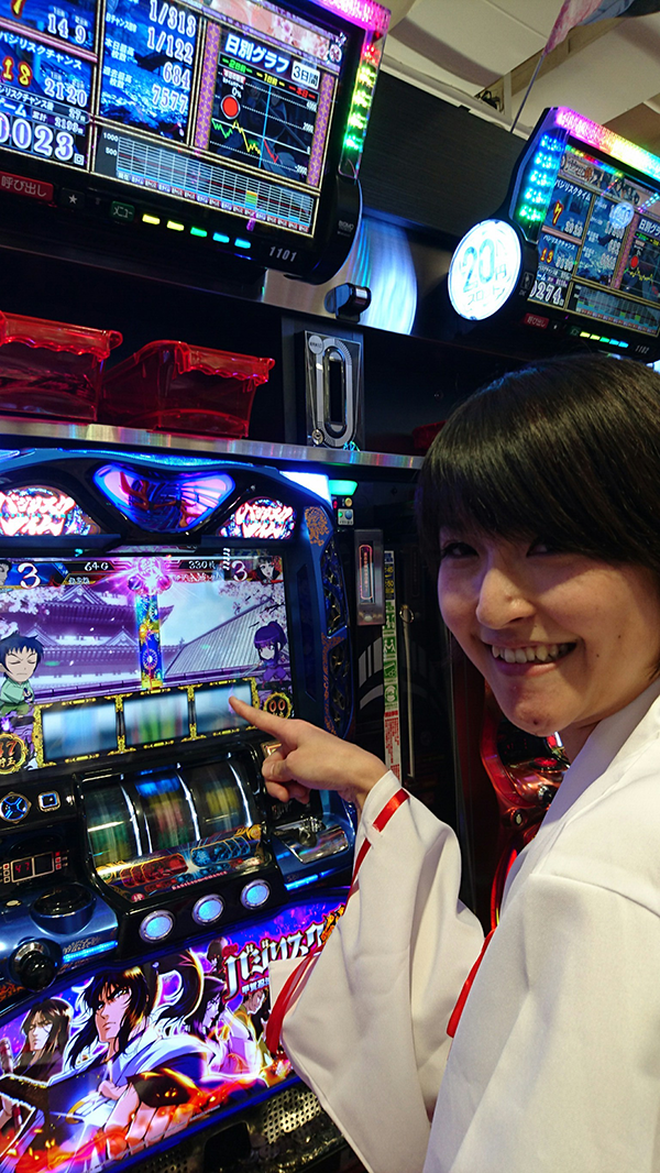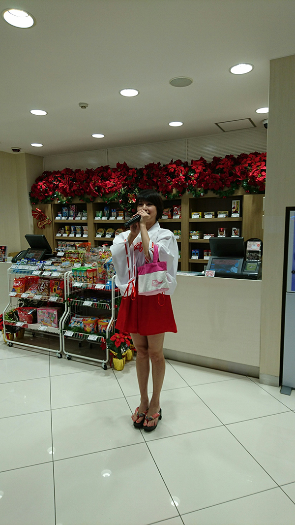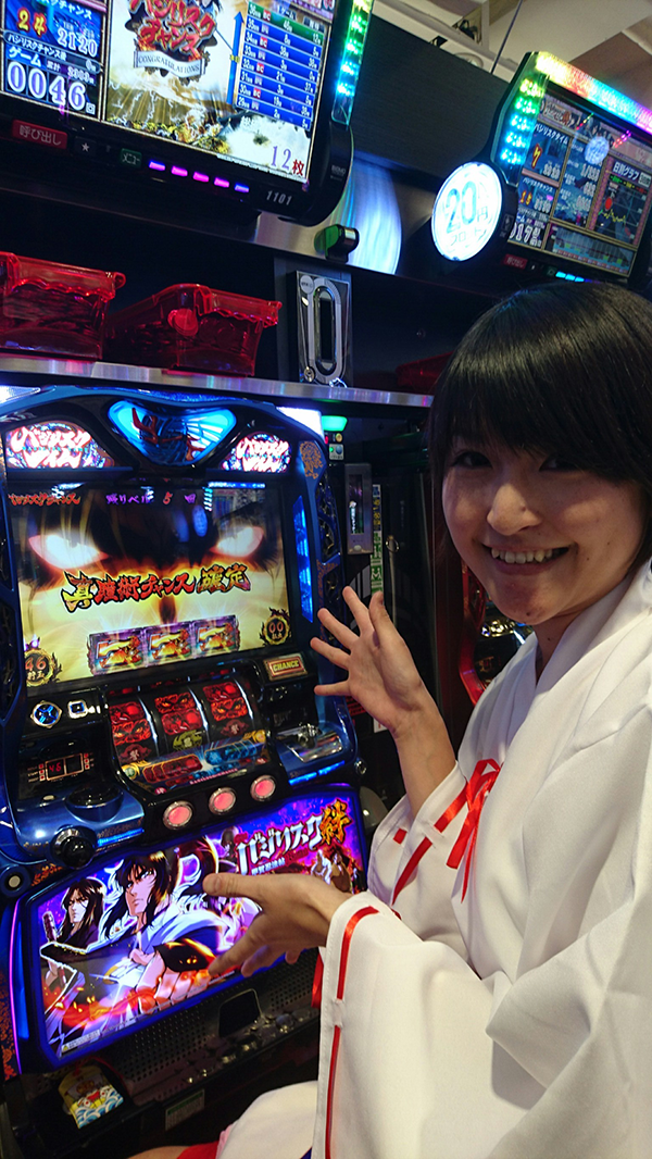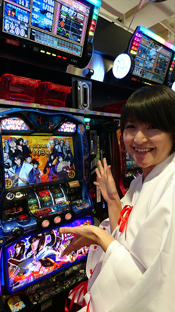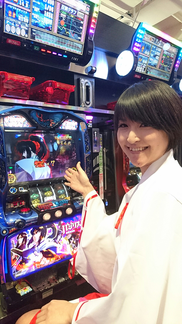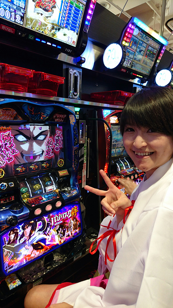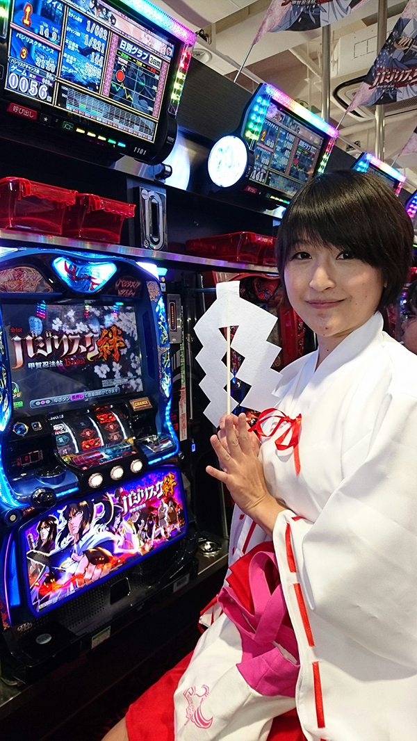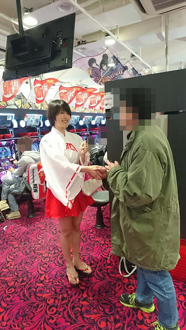 巫女さん風コスチュームで登場♪ ご挨拶が終わったら、さっそく実戦開始といこう!