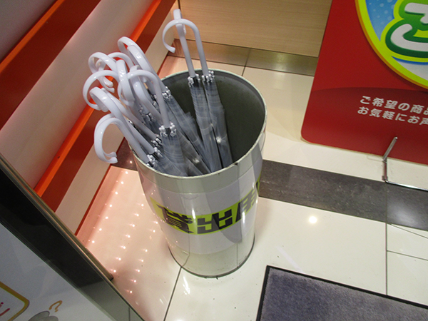 また、この日は悪天候であったため、入り口付近に貸し傘が置かれていたことも印象に残っている。