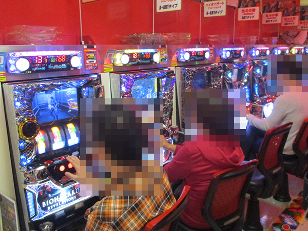 「パチスロ バイオハザード リベレーションズ」や「盗忍!剛衛門」、「SLOT魔法少女まどか☆マギカ」などのにぎわいも大きい。華やかな光景が広がっており、楽しげなムードに包まれていた。