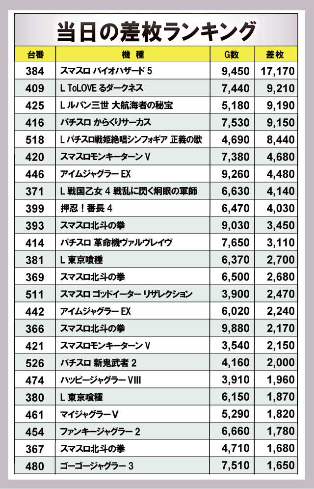 まずは当日の差枚ランキングを紹介していこう。24台のうち18台が差枚+2,000枚オーバーで、+3,000枚オーバーは11台出現。それらのなかでもっとも優秀だった台は、384番台の「スマスロ バイオハザード5」で、差枚は+17,170枚と凄まじい記録が飛び出し、店内の盛り上がりをリード。スマスロ人気機種が中心となって盛り上がりを形成していたのが鮮烈だ。