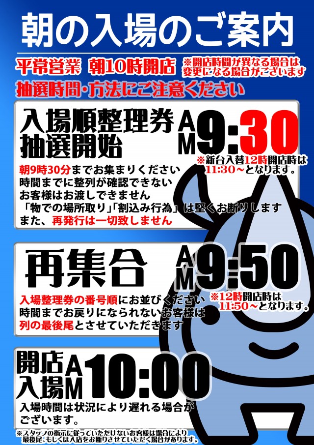 あさ9:30より抽選開始、9:50再整列になります。抽選ご希望の場合はあさ9:30までにお集まりください。 |