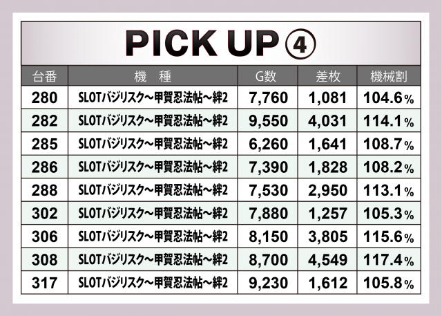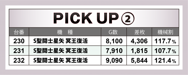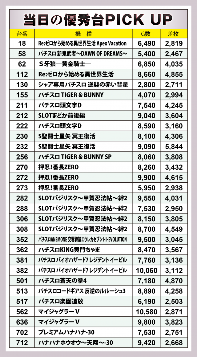 まずは優秀30台PICK UPからチェック。30台全てが差枚数+2千枚以上、またその3分の2が+3千枚以上となった。後述する好調6機種以外で目立ったのがそれぞれ+4千枚突破台を生み出した『S牙狼―黄金騎士―』『Re:ゼロから始める異世界生活』『パチスロコードギアス 反逆のルルーシュ3』などの機種。この他+3千枚クラスがゴロゴロ!