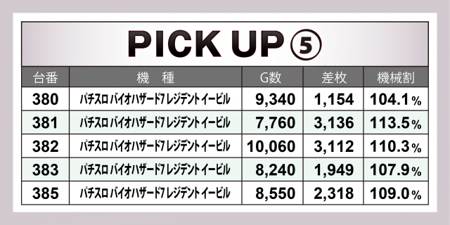 さらにこの日は6機種が高い差枚数を残した。9台で+2万2千枚強の『SLOTバジリスク~甲賀忍法帖~絆2』、各々3台合計で+1万枚突破の『S聖闘士星矢 冥王復活』『押忍!番長ZERO』、共に5台トータルで+1万枚オーバーの『パチスロ バイオハザード7 レジデント イービル』『マイジャグラーⅤ』と、それぞれが絶好調!