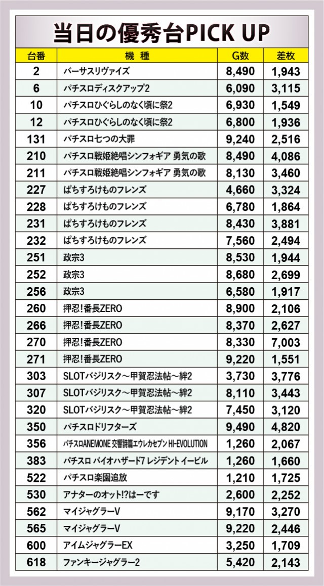 ピックアップされた優秀台をチェックすると、機種単位での活躍が目立っている様子が窺える。『押忍!番長ZERO』で+7,003枚、『SLOTバジリスク~甲賀忍法帖~絆2』では+3,776枚など、人気機種の活躍は当然だろう。これに加えて『パチスロ戦姫絶唱シンフォギア 勇気の歌』では210番台+4,086枚・211番台+3,460枚のように、各所で熱気を放つ台が見られた。