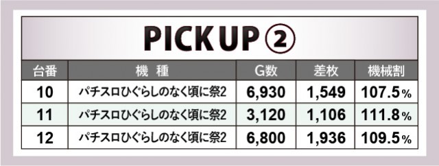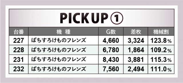 機種単位での活躍が見られたなか、『ぱちすろけものフレンズ』『パチスロひぐらしのなく頃に祭2』の両機種は特に目を惹く存在だった。それぞれ多くのゲーム数が消化され、さらに231番台+3,881枚・227番台+3,324枚といった記録が生まれている。両機種ともスペックが異なるものの、しっかりとプラス差枚を達成している部分も好印象だ。