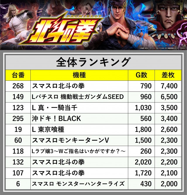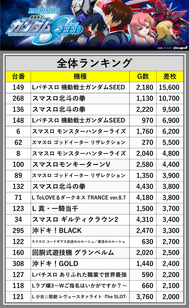 厳選された取材対象機種をはじめ、その他スロット全体から好記録が飛び出した!プレイヤーが楽しんだ1日を下記データにて振り返ってみて欲しい。