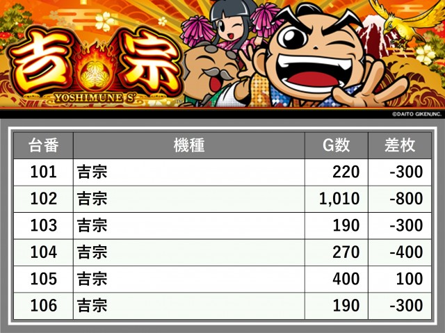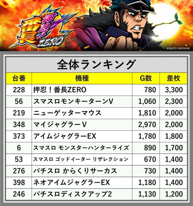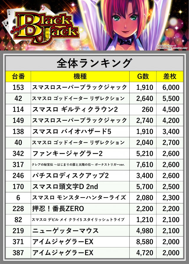 厳選された取材対象機種をはじめ、その他スロット全体から好記録が飛び出した!プレイヤーが楽しんだ1日を下記データにて振り返ってみて欲しい。