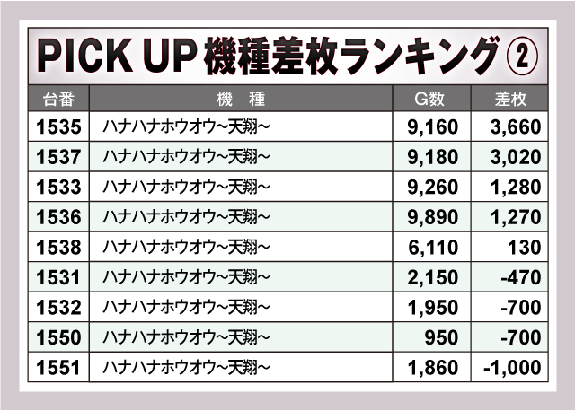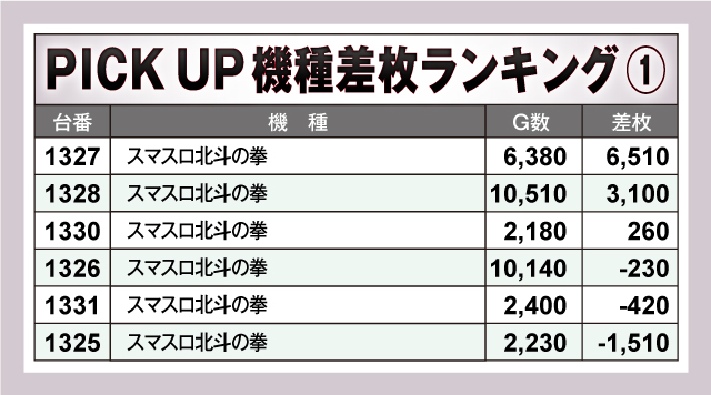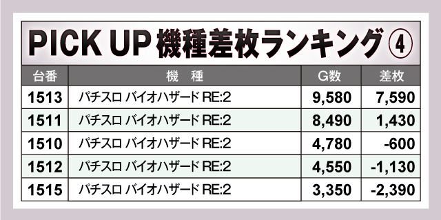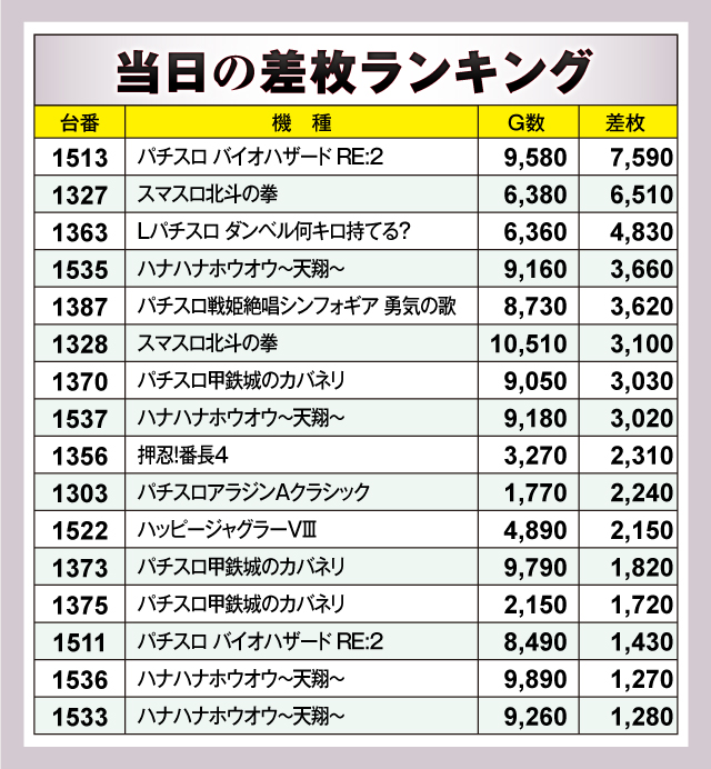 まずは当日の差枚ランキングの紹介から。16台のうち11台が差枚+2,000枚オーバーで、それらのなかでもっとも優秀だった台は、1513番台の「パチスロ バイオハザード RE:2」で差枚は+7,590枚を獲得! またランクイン機種を見渡すと、「スマスロ北斗の拳」を筆頭に「ハナハナホウオウ~天翔~」や「パチスロ甲鉄城のカバネリ」など、ファンからの注目度が高い機種がランクインしていたので、次回以降はしっかりチェックしておこう!