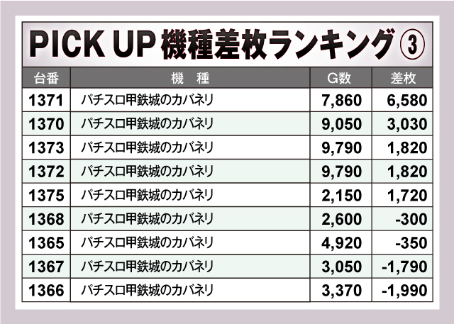 続いては、当日とくに盛り上がっていた4機種を紹介。どの機種からも優秀な台が出現していたが、とくに「パチスロ甲鉄城のカバネリ」は、ピックアップ9台のうち5台が+1,000枚オーバーのプラスと素晴らしい結果をマーク! またその他3機種も素晴らしく、ピックアップ機種全てがトータルプラス終了していたぞ!
