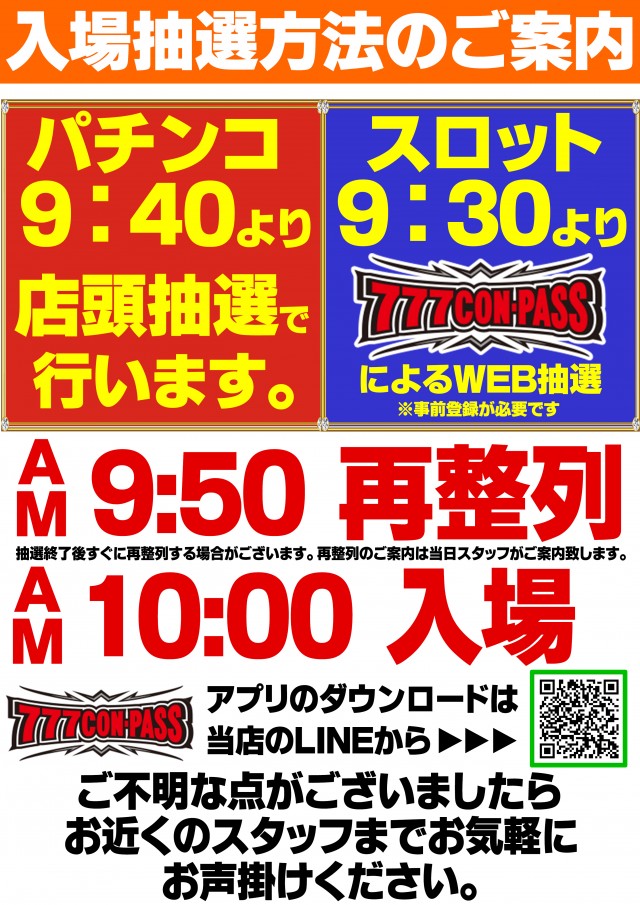 パチンコ⇒店頭抽選9:45開始、スロット⇒777CONPASS抽選 |