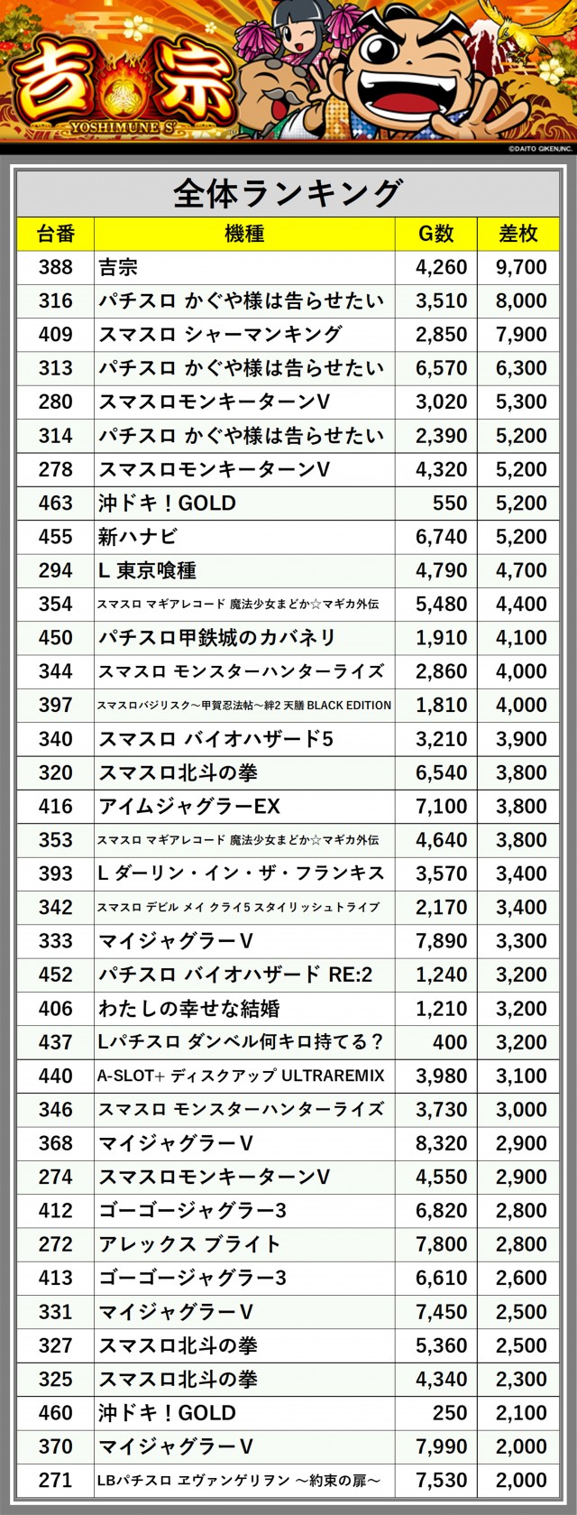 ※差枚数順に掲載しています