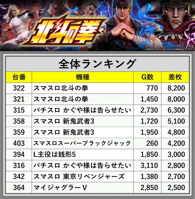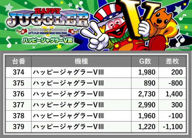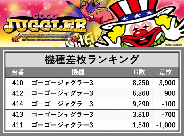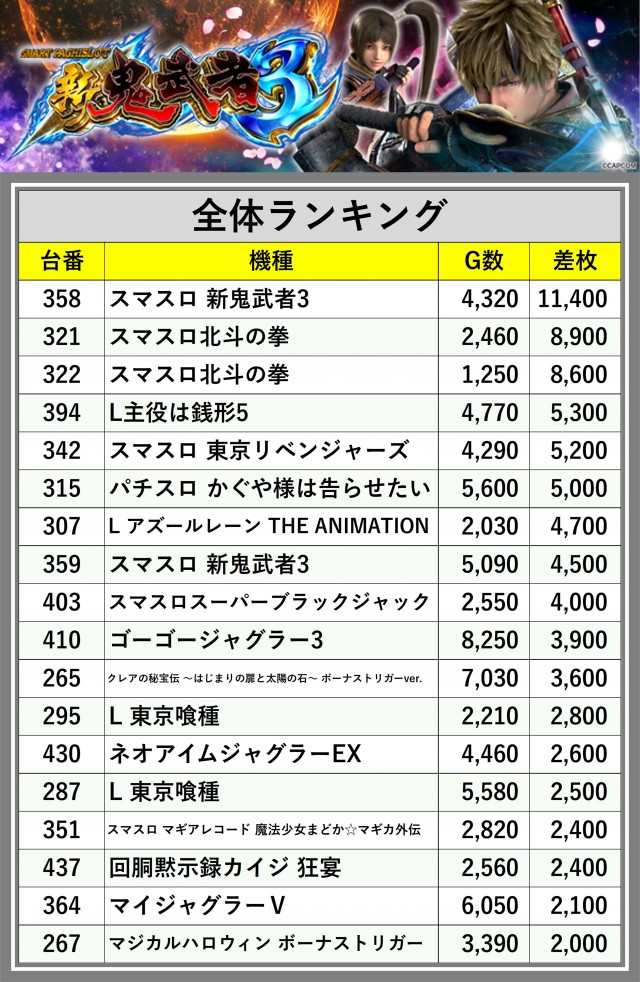 厳選された取材対象機種をはじめ、その他スロット全体から好記録が飛び出した!プレイヤーが楽しんだ1日を下記データにて振り返ってみて欲しい。