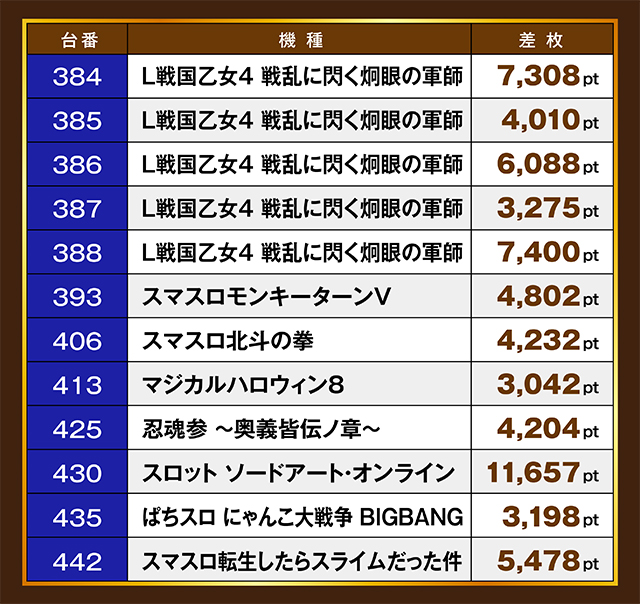 今回の「ウエスタン西葛西店」の結果は全巻読破。 初回からいきなり全巻読破を易々とやってのけるあたりはさすが西葛西店といったところ。注目は「須磨ノ物語」の結果。3,000枚を上回る記録が多数生まれていたようで、その中でも『スロット ソードアート・オンライン』430番台は+11,000枚オーバーを達成!さぞかし濃厚な読後感を得られたことだろう。