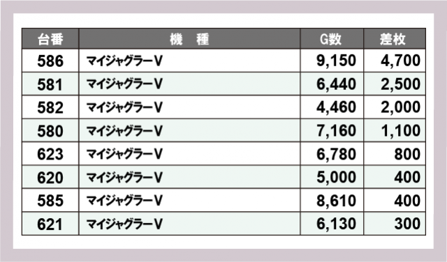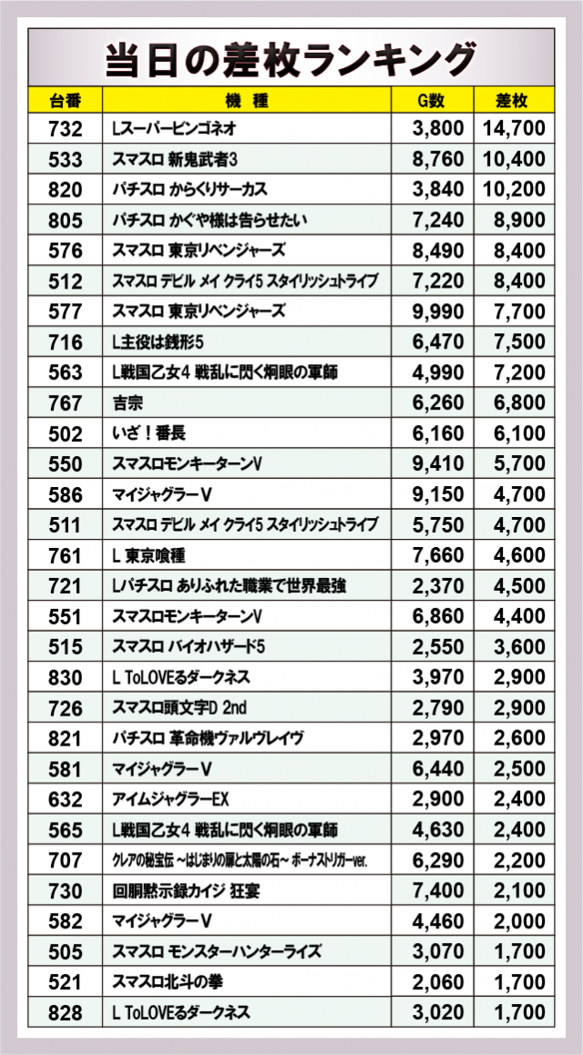 ※差枚数順に掲載しています