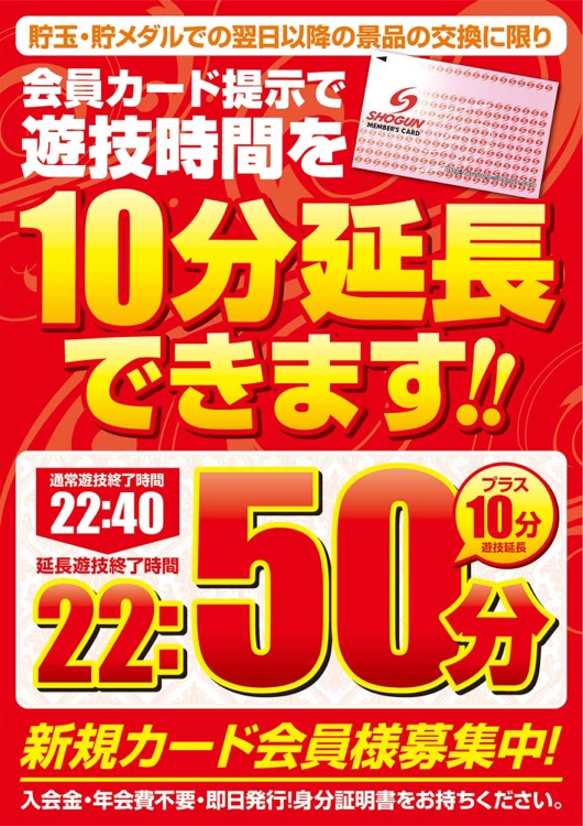 10:00~22:40 当店会員様に限り22:50まで延長遊技可能(景品交換は翌日以降となります。) |