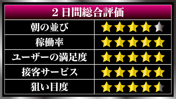ジャグラーシリーズや「ハナビ」をはじめとするボーナスタイプも大好評。機種の醍醐味を味わえている様子からは、充実した時間を過ごせていることもうかがえた。