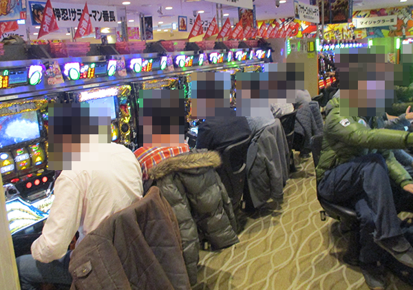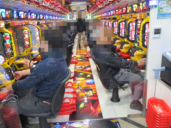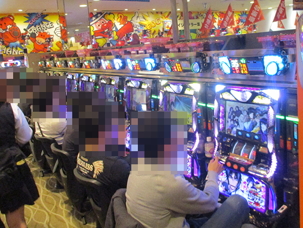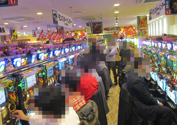朝イチのパチスロをみると、「パチスロ モンスターハンター 月下雷鳴」や「バジリスク~甲賀忍法帖~絆」など、多くの機種がすぐさま満席。