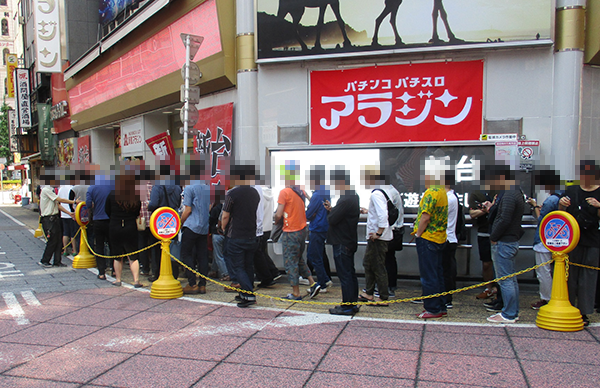 9時からおこなわれたパチスロの入場抽選には140名前後のプレイヤーが参加し、パチンコと一般入場をあわせると200名近い人数が集まっていた。