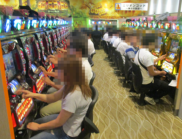 朝イチのパチスロをみると、「パチスロ モンスターハンター 月下雷鳴」や「ミリオンゴッド-神々の凱旋-」など、さまざまな機種が満席。