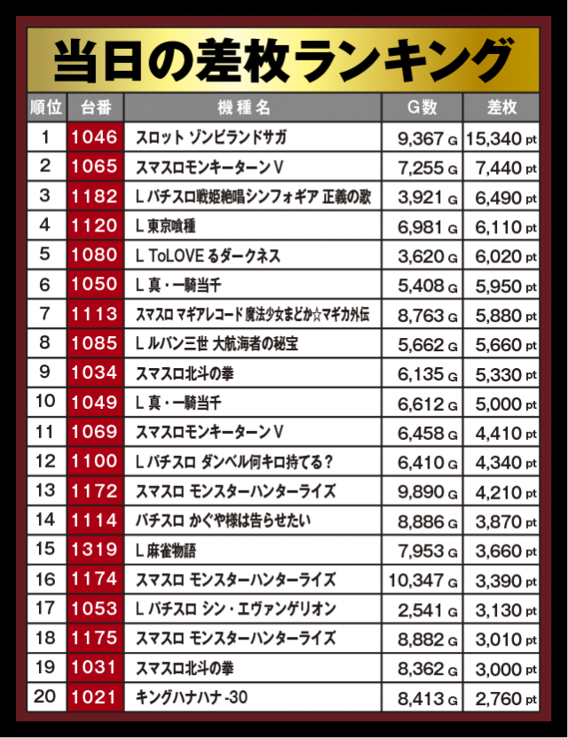 【差枚ランキング&注目機種】SAP日野(東京都)