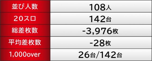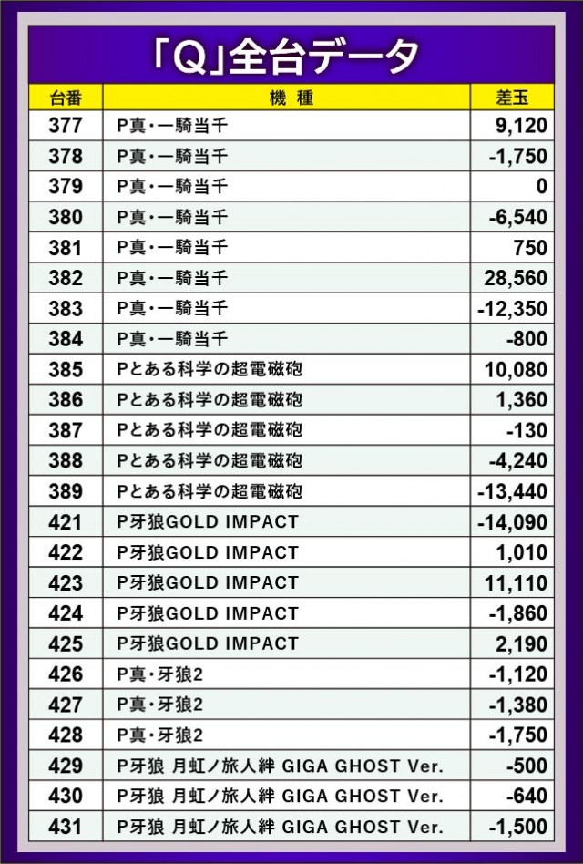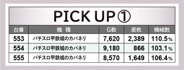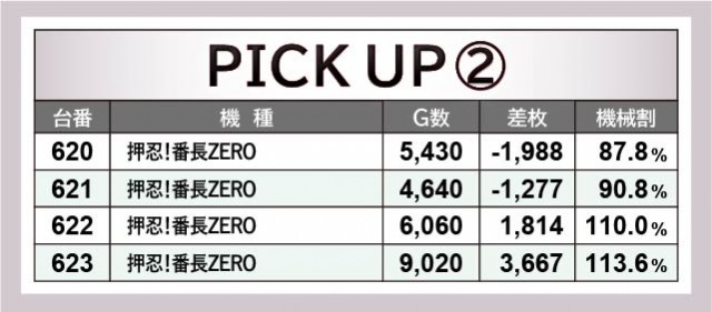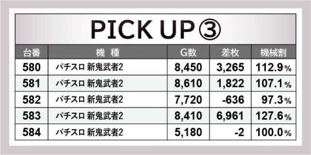 『パチスロ甲鉄城のカバネリ』全3台がプラス差枚を達成し、回転数の多さからも手ごたえの程を窺うことができる。『押忍!番長ZERO』『パチスロ 新鬼武者2』もまた同様で、こちらは回転数と差枚数が比例する展開が顕著となっているのが特徴的だ。その中で583番台+6,961枚という突出した記録を出した『パチスロ 新鬼武者2』は、特に盛り上がりを見せていたエリアと言えるだろう。