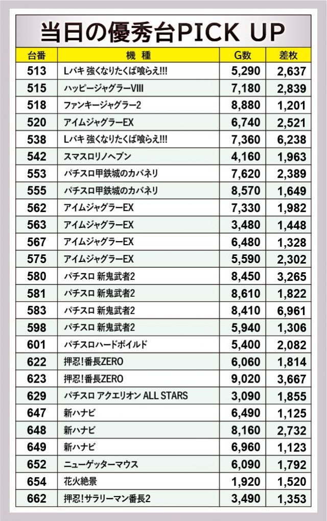『Lバキ 強くなりたくば喰らえ!!!』538番台+6,238枚、『パチスロ 新鬼武者2』583番台+6,961枚という熱量を確認でき、他にも2~3千枚OVERを多くに見られる内容に。特筆すべきはまとまった機種の活躍が見られる点で、これには活気&熱気を放つエリアがハッキリとしていたのではと窺えるだろう。以下では機種単位での活躍をまとめていき、より詳細に店内の様子を覗いていくことにしよう。