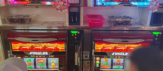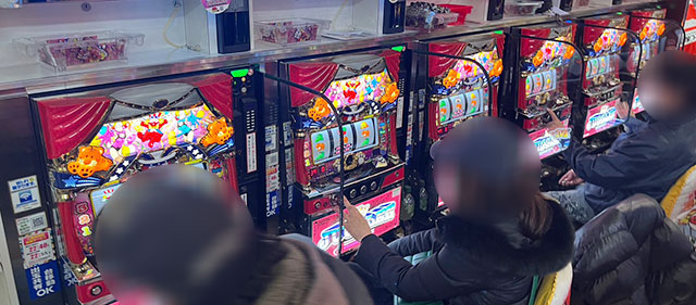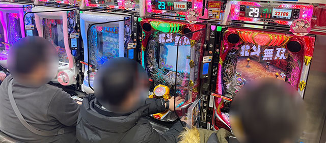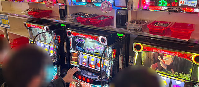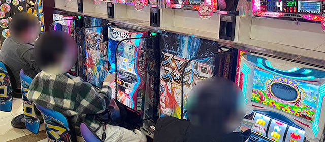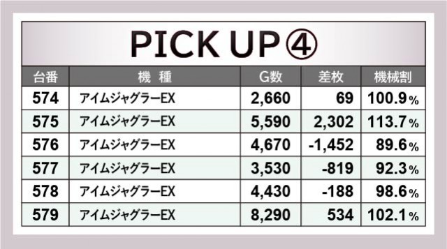 『アイムジャグラーEX』も存在感を放っており、579番台は朝から閉店までじっくりと打ち込まれていた。途中、展開にこそ恵まれなかったが、しっかりとプラス域で終えているのは好感を覚えるポイントだ。また575番台+2,302枚と結果を出す台もあり、各所でGOGOランプの輝きやボーナスのファンファーレが流れるなど、とても華やかな雰囲気に会った様子が窺える。