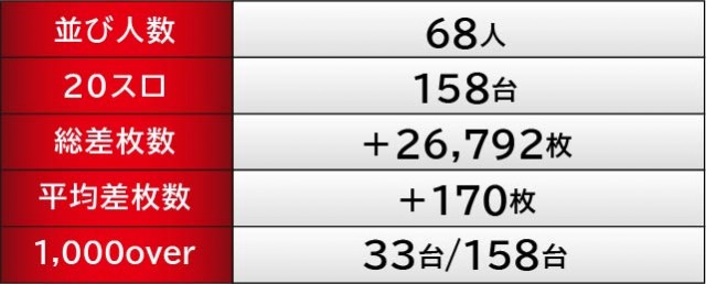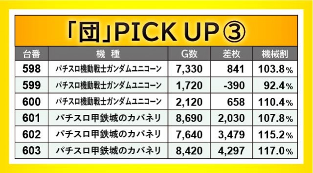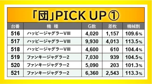 今回は6台横並び好況スポットが3ヶ所見られ、該当したのが516~521番台・542~547番台・598~603番台となっている。やはり『HEY!エリートサラリーマン鏡』544番台+5,767枚や545番台+5,996枚の活躍が目を惹くばかりで、他にも『ハッピージャグラーVⅢ』517番台+4,013枚や『パチスロ甲鉄城のカバネリ』603番台+4,297枚といった記録もあり、各機種でファンは笑顔を覗かせていたことだろう。