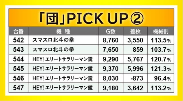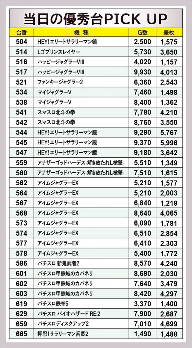 導入されたばかりの機種『Lゴブリンスレイヤー』『アナザーゴッドハーデス-解き放たれし槍撃ver.-』がさっそく優秀台に名を連ねている。また『HEY!エリートサラリーマン鏡』や『アイムジャグラーEX』といった機種はまとまりのある活躍を披露し、リストに多くの数を記しているのも特徴的だ。差枚数にしても544番台+5,767枚や545番台+5,996枚のように、突出している点も見逃せない