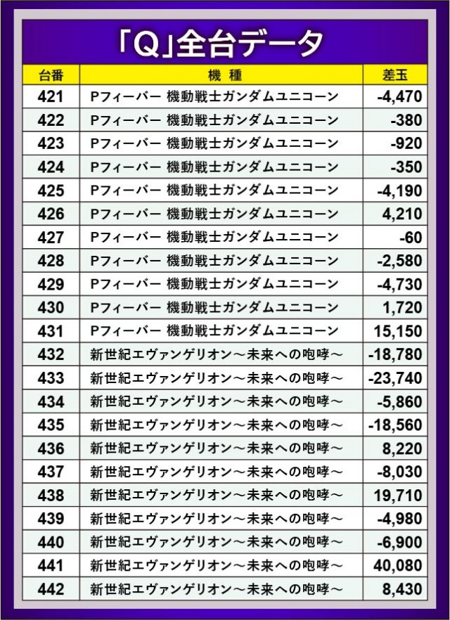 対して『新世紀エヴァンゲリオン〜未来への咆哮〜』は441番台+40,080玉という大きな記録を確認できる。438番台についても約2万発の記録を打ちたてており、同機種らしい性能が存分に発揮されたと言えるだろう。