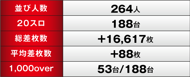 前回の実施から12日後の11月23日、再び「ジアス南大沢店」にて「ヒーローズレポート」が実施された。当日はスペシャルサポーターの田中逆回転が参戦し、20スロ設置台数を大きく超えるファンたち264人が集結。開店前から期待感MAX状態で、どれほどの盛り上がりを見せてくれるのか、多くの人たちの注目が集まった。その結果は…+16,617枚プラスで終了! 前回よりは低い総差枚数ではあったものの、見事連勝記録の更新に成功した! ここからは、全188台の詳細データとともに、当日の盛り上がりをチェックしていこう!