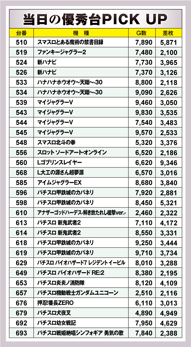 まずは優秀台全30台のピックアップから。30台すべてが+2,000枚オーバーで、+3,000枚オーバーは20台。そして最優秀台は560番台の「Lゴブリンスレイヤー」で、差枚+9,346枚という結果となった。30台を注意深くチェックすると、スマスロや6.5号機のほか、ジャグラーシリーズを含めたノーマルタイプが10台ランクイン。多くの人が楽しめるよう、それぞれのタイプにバランス良く用意されていたことが窺えた!