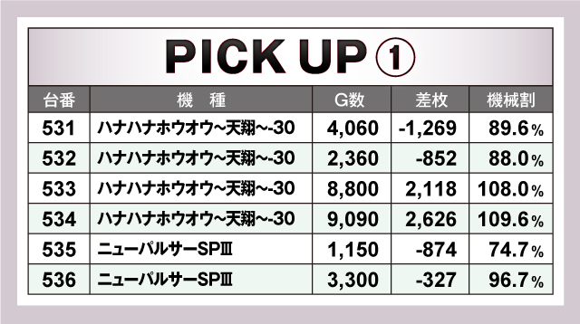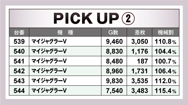 続いては、並びで好調だった2箇所を紹介。どちらもノーマルタイプの6台並びで、しっかりとトータルプラスを達成。とくに539番台〜544番台の「マイジャグラーⅤ」の並びは、全台がプラス終了の平均+2,194枚と圧倒的! ほぼぶん回し状態だったので、遊技していた人たちは確信して回していた可能性が高そうだ!