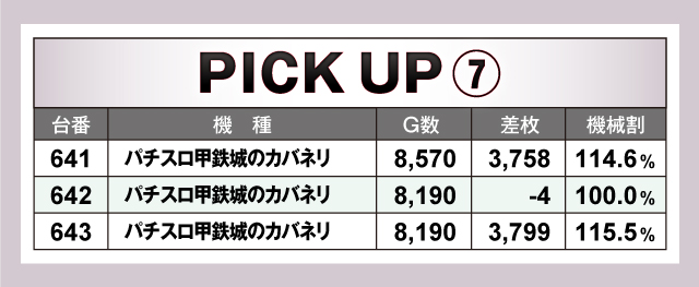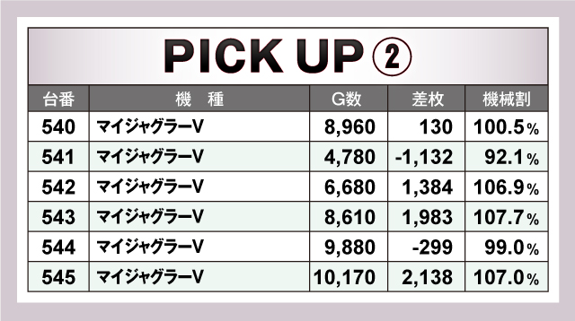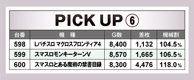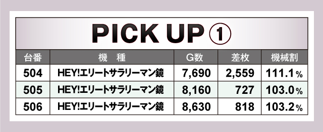 続いては、並びで活躍していた7箇所を紹介。7箇所すべての並びがトータルプラス終了しており、そのうち4箇所が平均+1,000枚オーバー! なかでも551番台〜553番台の「スマスロ北斗の拳」「L主役は銭形4」の3台並びは、3台全てがプラスの平均+2,794枚で7箇所の並びの中でもっとも優秀だった! その他の並びにも良台を多数確認できたので、同店で遊ぶ際は並びに注目して立ち回ってみよう!