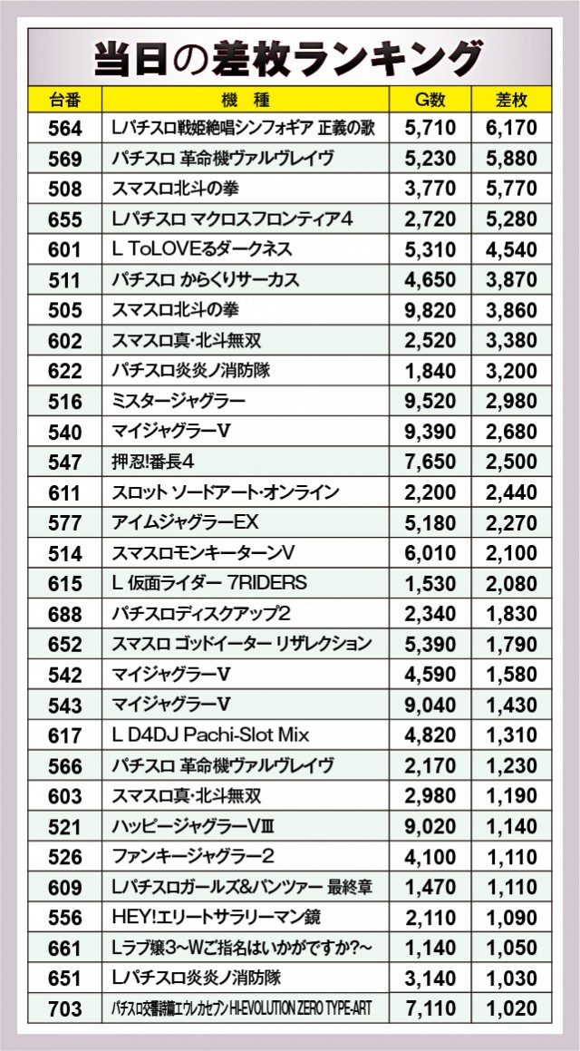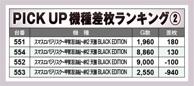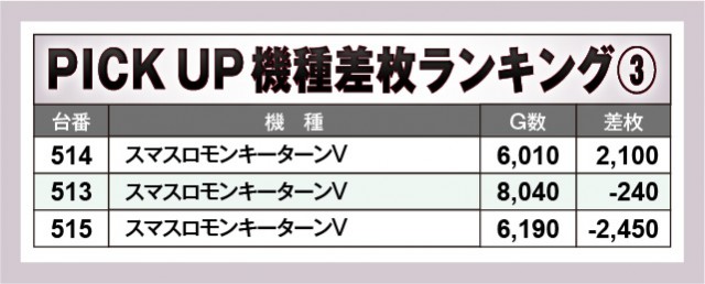 『マイジャグラーⅤ』にて8~9,000回転台をマークした台が3台もあり、好感触を得ていた様子が顕著である。それは『スマスロバジリスク~甲賀忍法帖~絆2 天膳 BLACK EDITION』『スマスロモンキーターンV』も同様で、遊技していたファンはレバーを叩く喜びを感じていたはずだ。大きなマイナスも少なく、ポテンシャルを秘めていたのは間違いない。