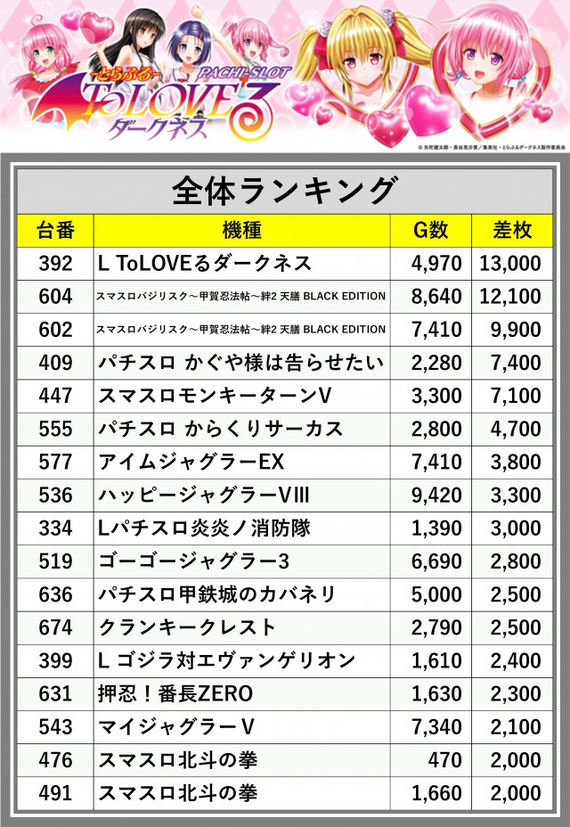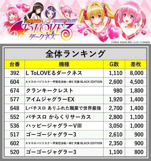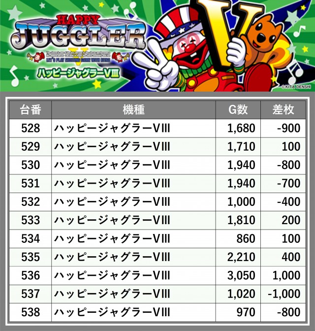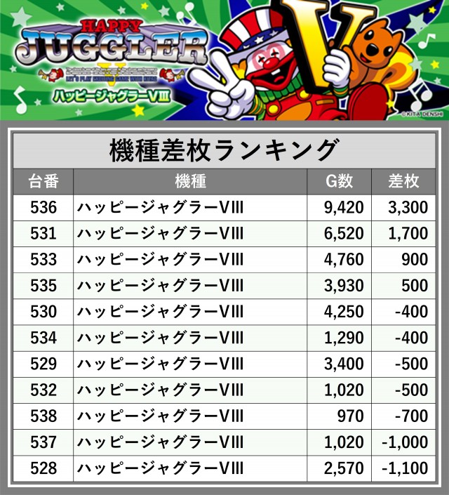 厳選された取材対象機種をはじめ、その他スロット全体から好記録が飛び出した!プレイヤーが楽しんだ1日を下記データにて振り返ってみて欲しい。