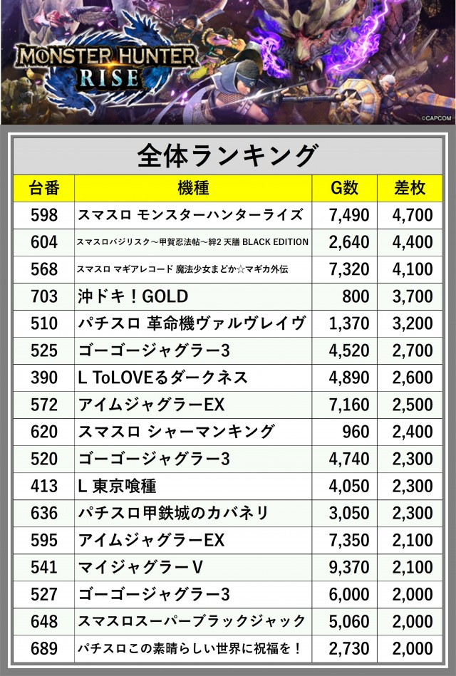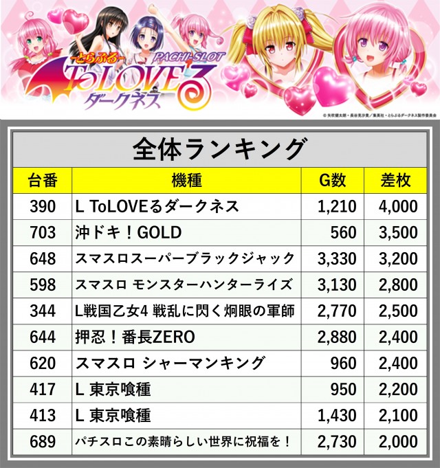 厳選された取材対象機種をはじめ、その他スロット全体から好記録が飛び出した!プレイヤーが楽しんだ1日を下記データにて振り返ってみて欲しい。