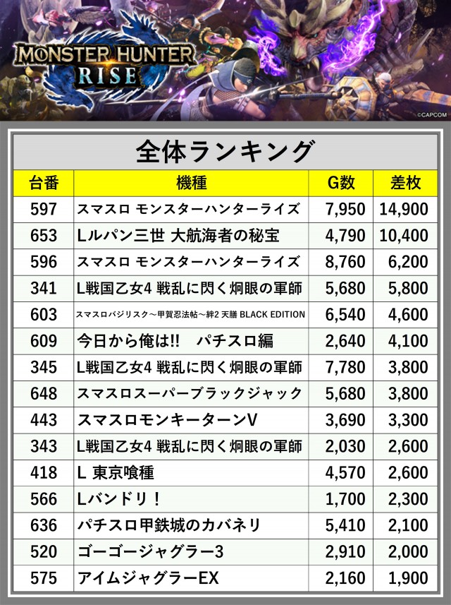 厳選された取材対象機種をはじめ、その他スロット全体から好記録が飛び出した!プレイヤーが楽しんだ1日を下記データにて振り返ってみて欲しい。