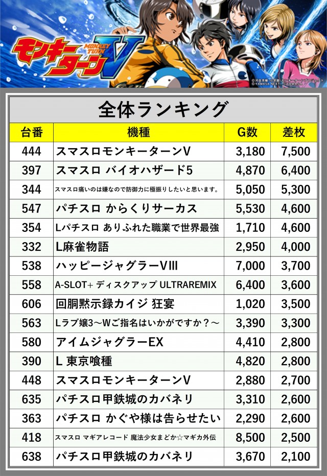 厳選された取材対象機種をはじめ、その他スロット全体から好記録が飛び出した!プレイヤーが楽しんだ1日を下記データにて振り返ってみて欲しい。