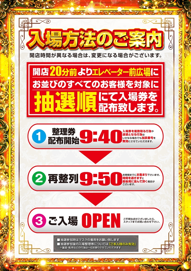 入場抽選参加券配布9:25分予定~ 入場抽選開始9:40分開始予定 入場抽選参加券お持ちのお客様を対象に抽選となります。※一部例外あり |