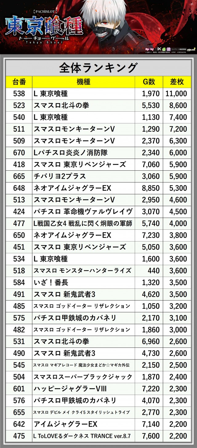※差枚数順に掲載しています