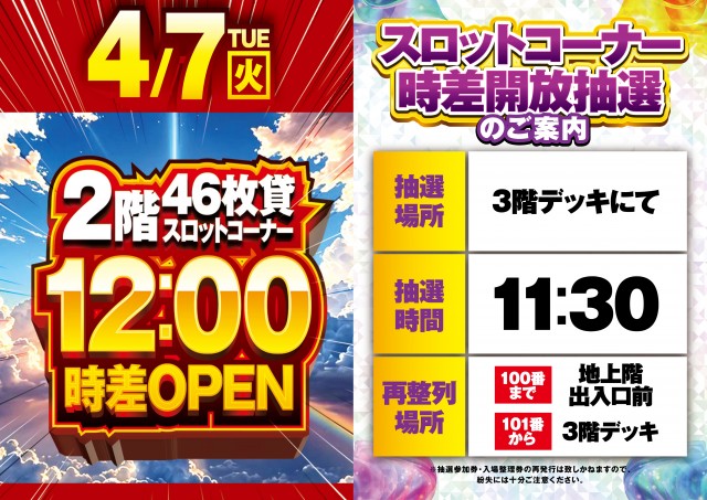 4/7(火)本日2Fスロットコーナー12時OPEN!