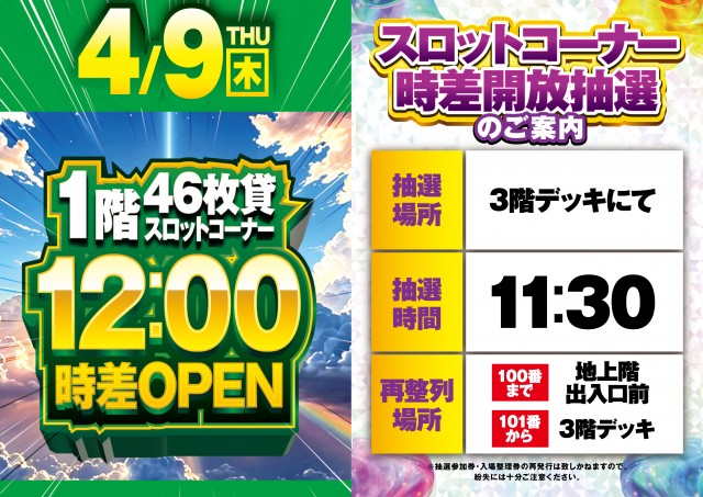 4/9(木)本日1Fスロットコーナー12時OPEN!