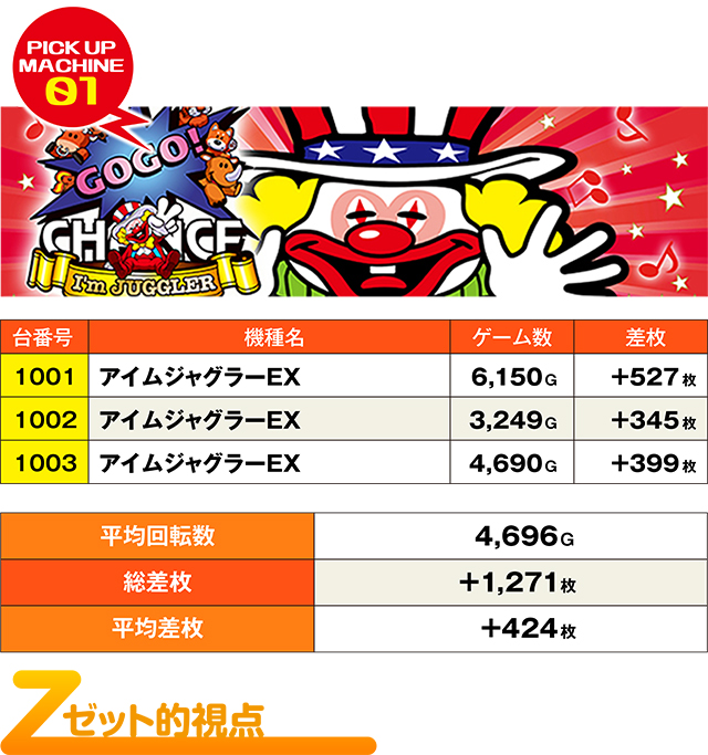 3箇所目の3台並びを『アイムジャグラーEX』コーナーで見つけたとなると、この日は相当数の優秀台が同機に眠っていたと考えて間違いないだろう。