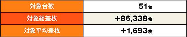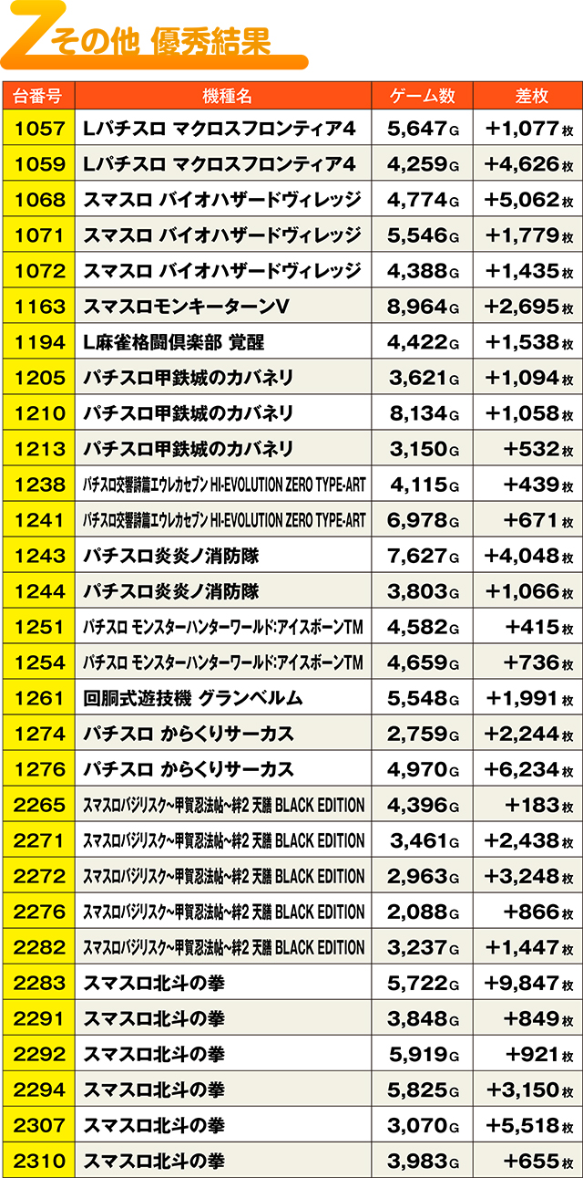 様々な機種から優秀台を彷彿させる結果が多数生まれたのは、上表から一目瞭然。3,000枚オーバーが8台、5,000枚オーバーが4台、極めつけは10,000枚に迫るハイパーレコードを叩き出した『スマスロ北斗の拳』だろう。