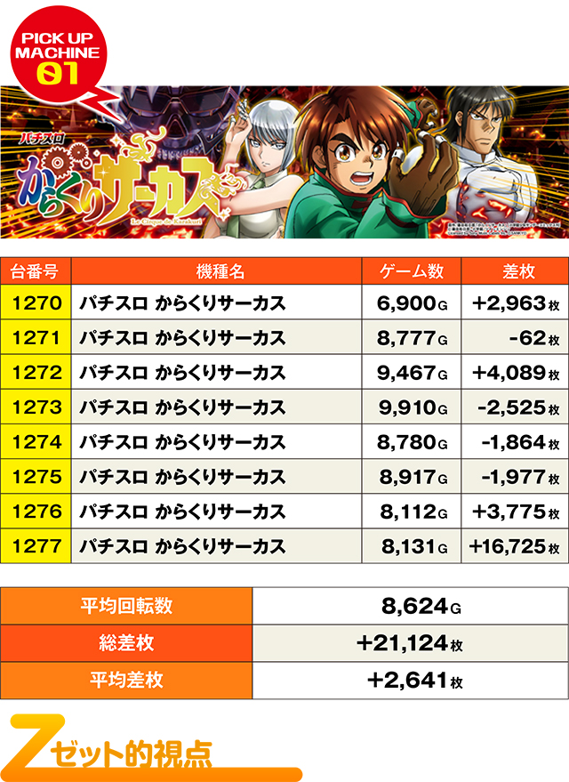 1277番台から16,000枚オーバーが飛び出した『パチスロ からくりサーカス』。加えて2,000枚オーバーが3台と、まずまずの結果を残してくれた。