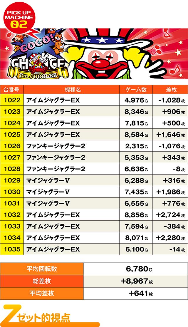 もちろん『ジャグラー』シリーズからも優秀台と思しき台をたっぷり確認。なんと14台並びで優秀台っぽい挙動を示していたのである。