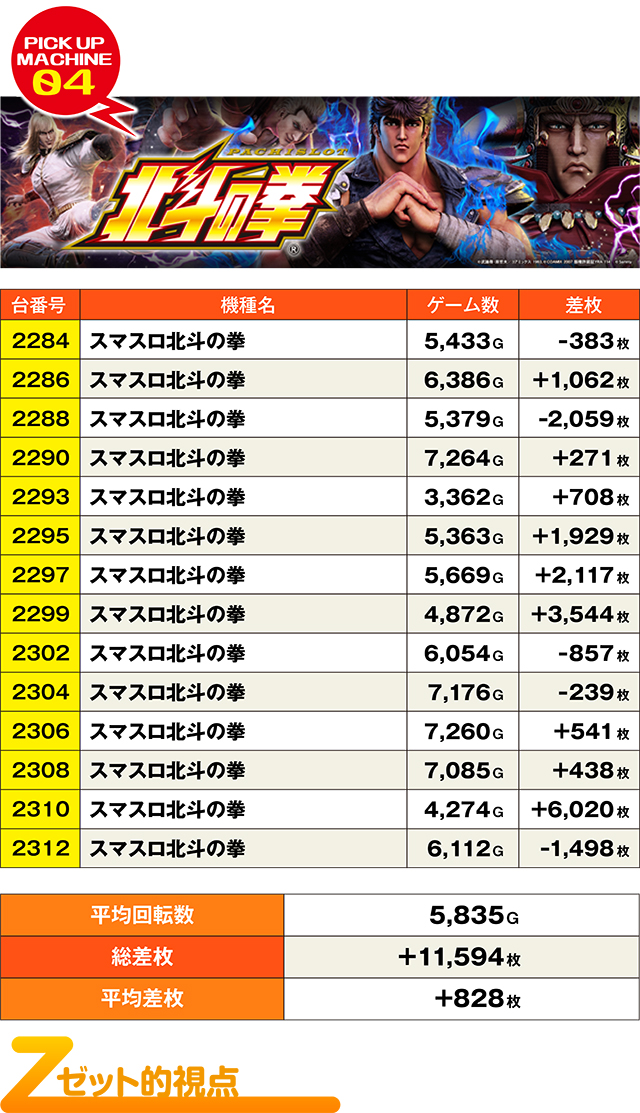 今回もやはり『スマスロ北斗の拳』から優秀台を数多く確認!マイナスで終わった無念な台もある中、2310番台が6,000枚オーバーの地力を見せつけた!