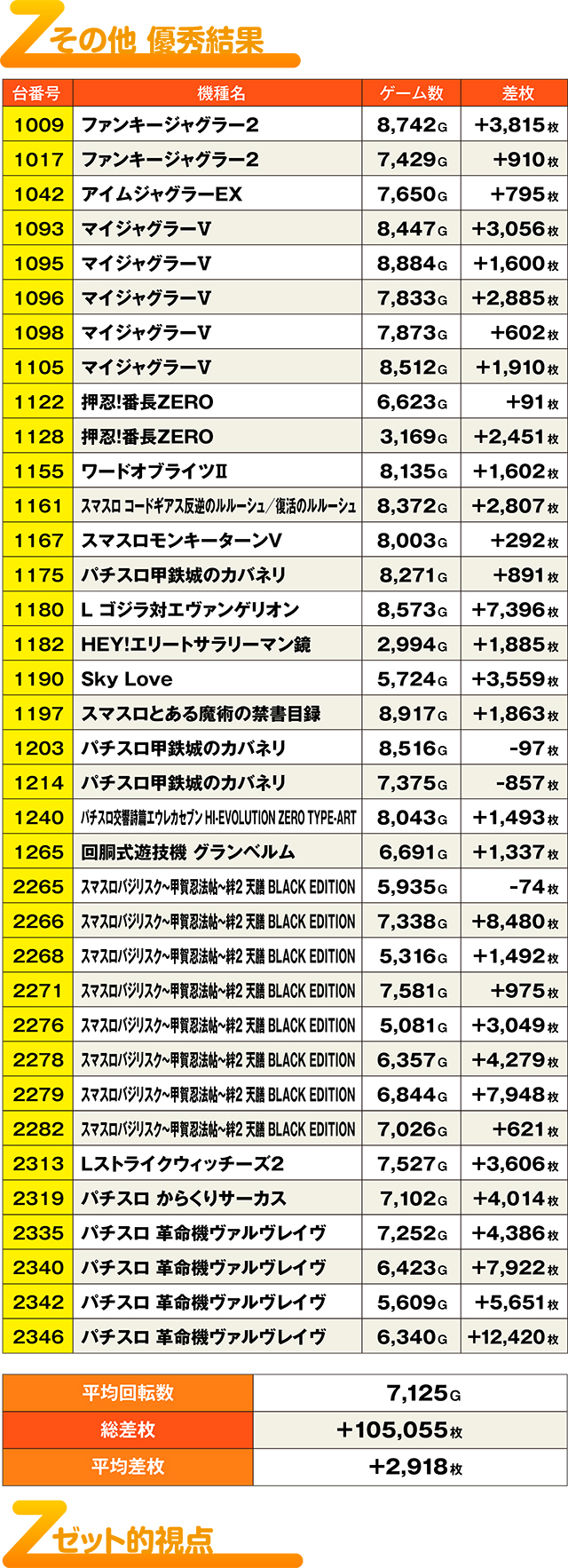 今回も並びの仕掛けを発見することができた。3台並び・8台並び・14台並びと、非常にバラエティに富んだ布陣だったように思う。しかし取材班が気づいたのがこの3箇所だったというだけで、実際にはまだ潜んでいた可能性も十分ある。さらに単品でも優秀台が存在していたのは先の結果からも間違いないだろう。