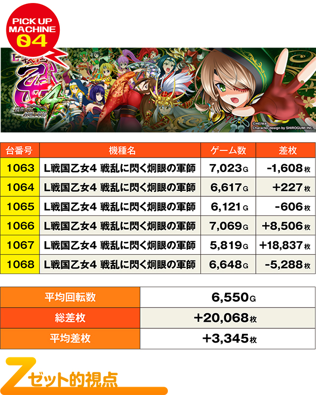 全台系っぽい動きを見せていた6台設置の『L戦国乙女4 戦乱に閃く炯眼の軍師』だが、その勝率は50%。しかし1066番台が8,500枚超え、1067番台が18,000枚超え(!)と、とんでもない記録を叩き出した。